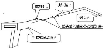 打開包裝箱,取出測試槍三節(jié),用手握定銅頭段,依次逐段旋接而成,避免扭動補(bǔ)償導(dǎo)線而斷焊,旋緊后應(yīng)無晃動感。將槍管內(nèi)的二芯插頭小心與手提式熔煉測溫儀上的連接套內(nèi)的同型號二芯插頭正確相連(信號插頭插入插座時(shí)務(wù)必插到底),后將測試槍插入連接套并用止頭螺桿擰緊。